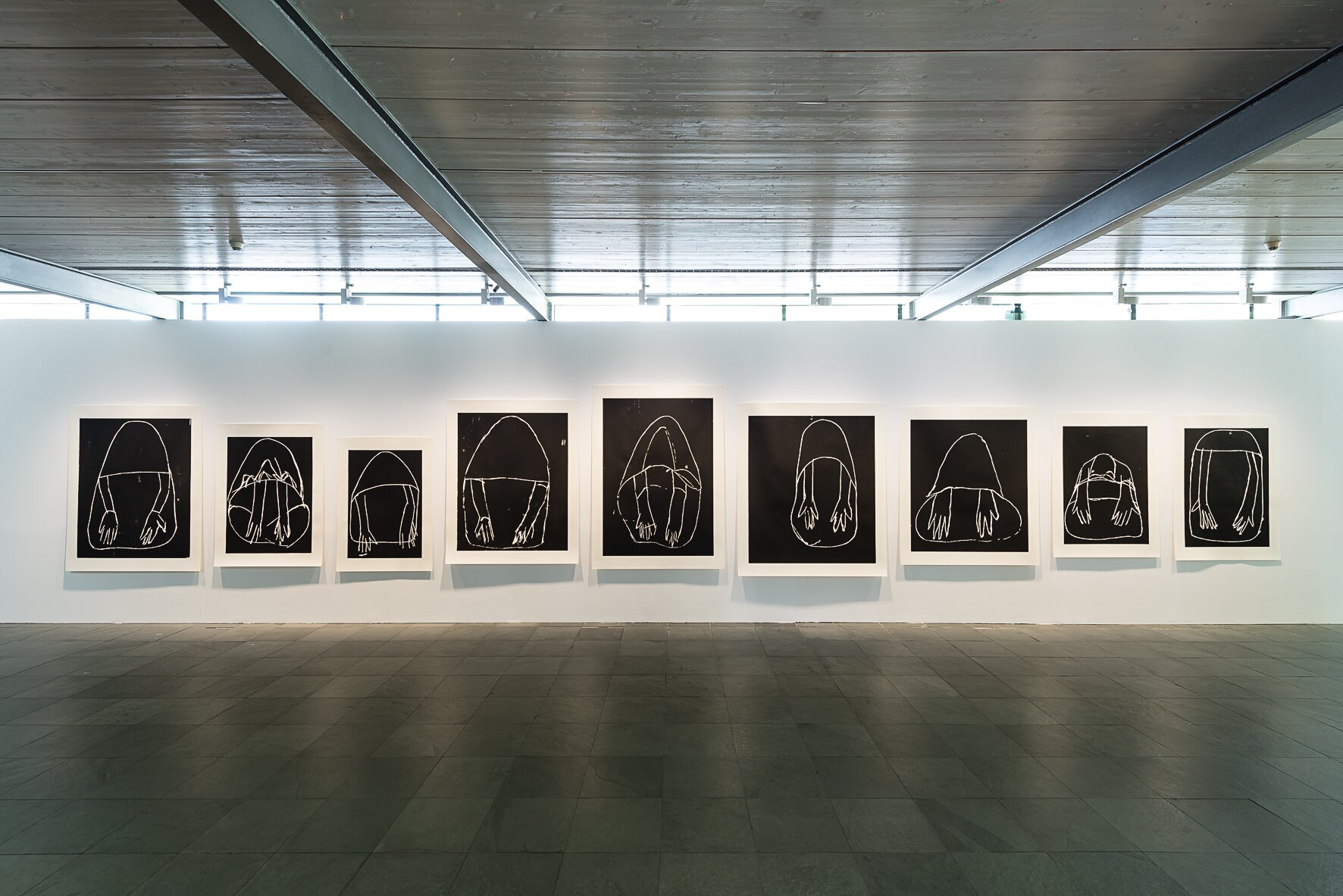 Andrea Büttner beschäftigt sich in technisch-medial vielfältigen Formulierungen mit nonverbalen Artikulationen des Menschen, die einem (Spannungs-)Verhältnis zwischen Innenleben und äußeren, sozialen und kulturellen Kontexten entspringen. Eines ihrer Hauptinteressen gilt körpersprachlichen Gesten und Haltungen, die, in Bild-Zeichen übersetzt, weit über den Zeitpunkt ihres Entstehens hinaus les- und verstehbar bleiben, wie z.B. Gestiken des sich Beugens, Verhüllens oder Hände Ausstreckens. So reduziert Büttner etwa Ernst Barlachs Figur der Verhüllten Bettlerin aus dem Jahr 1919 über das prämodernistische Medium des Holzschnitts auf deren primäre Ausdrucksträger. Trotz der damit erfolgten mehrfachen „Abstraktion“ und der Historizität des Vor-Bilds bleibt deren Inhalt verständlich.