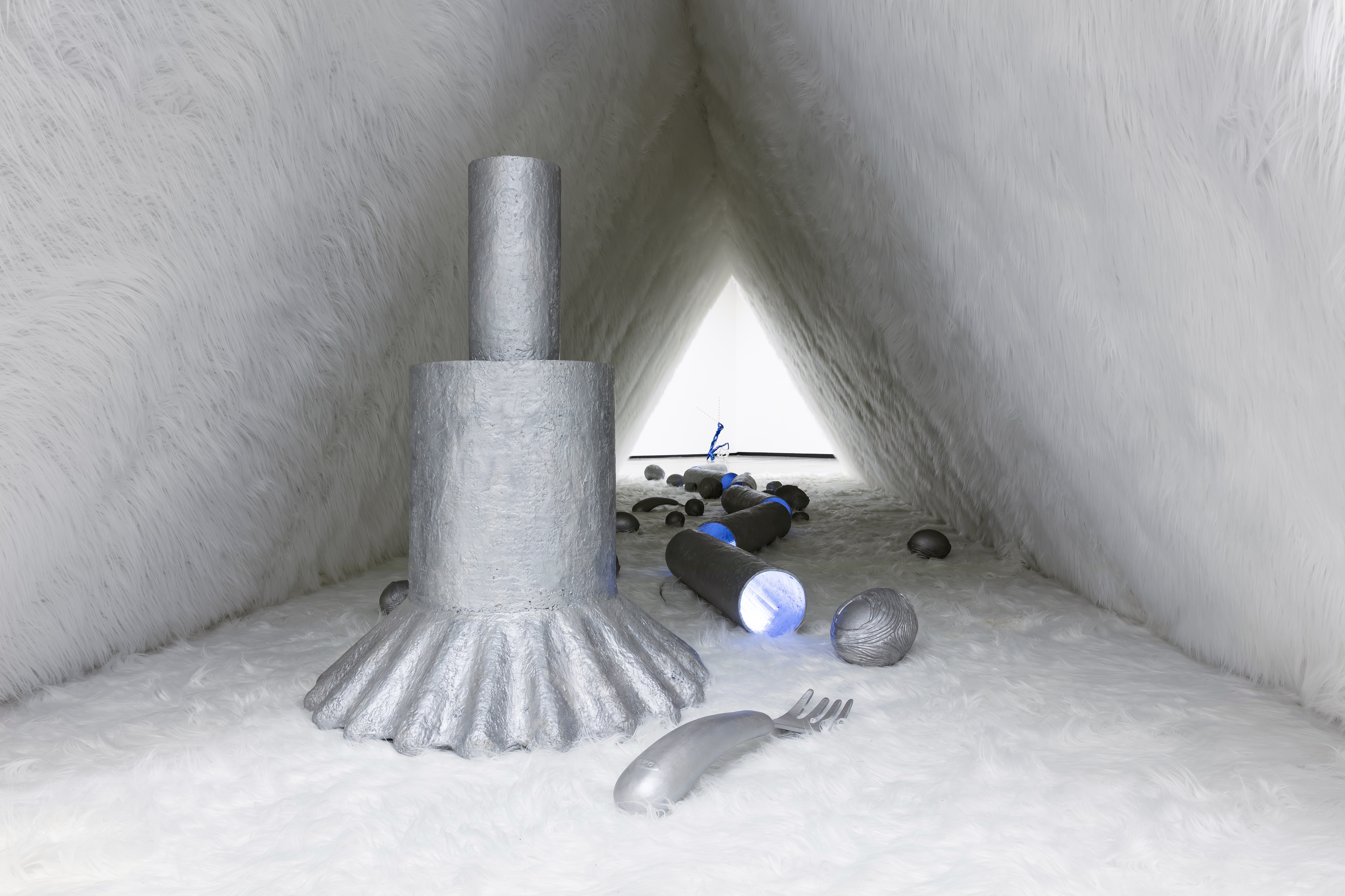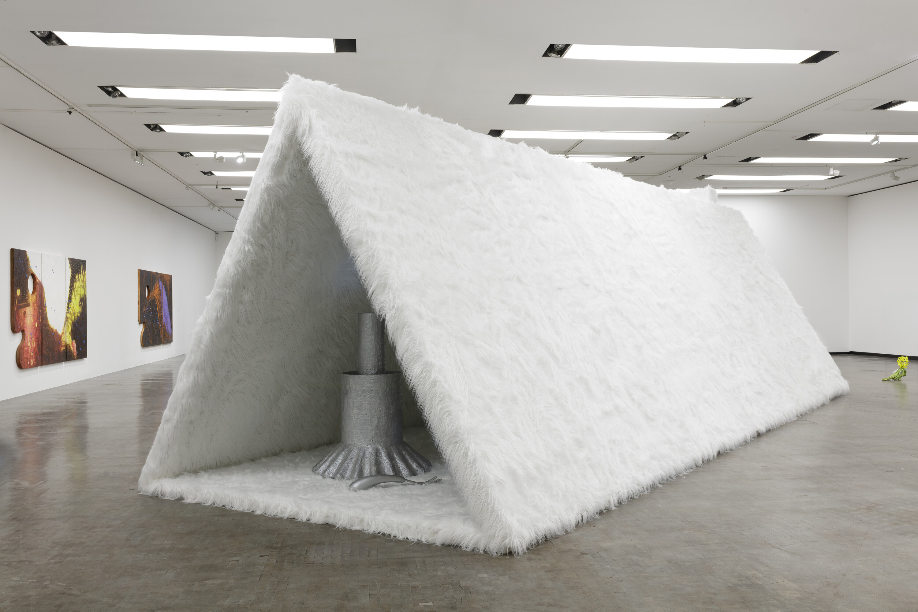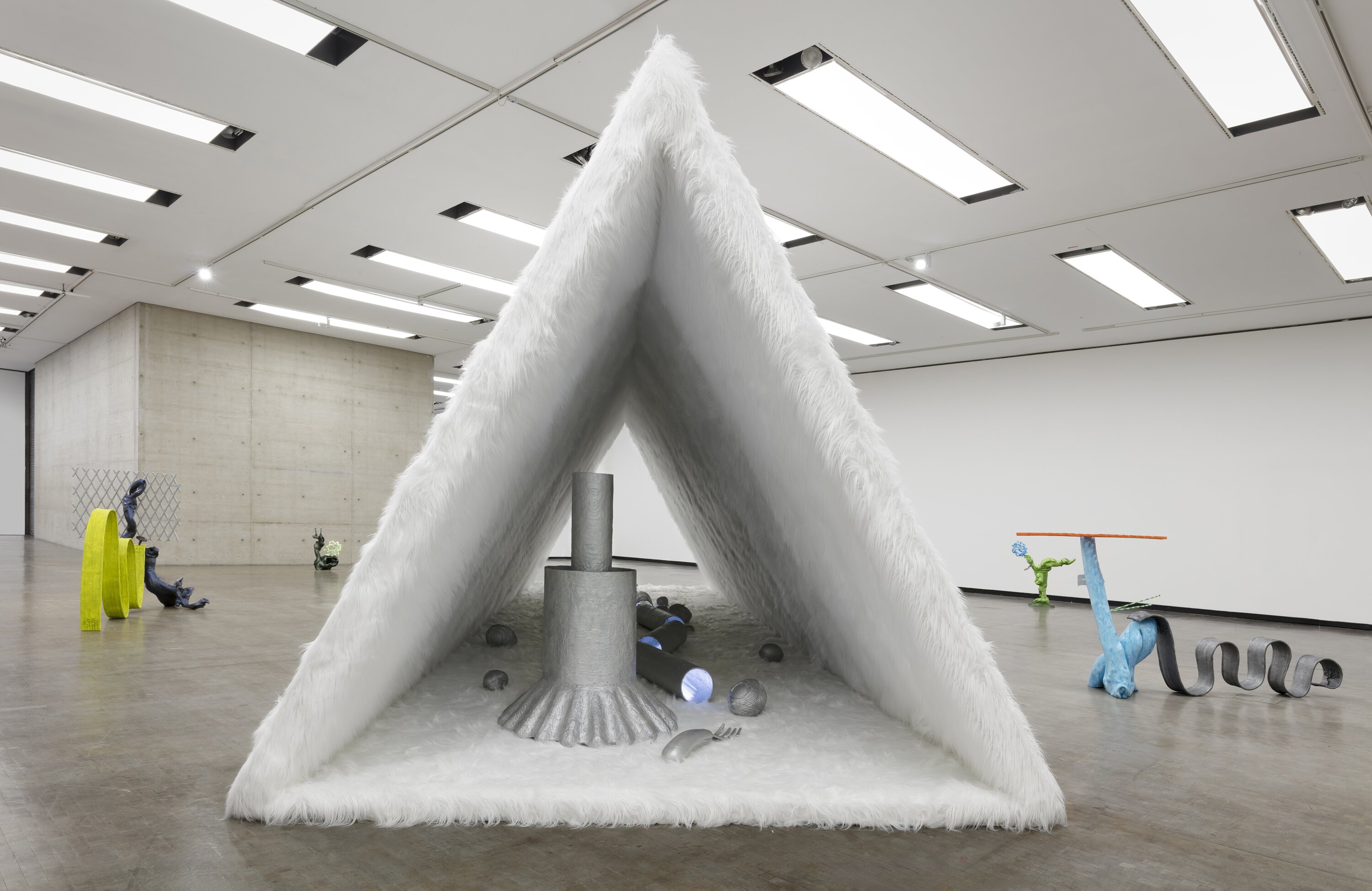 Eine große, pelzige Struktur teilt den Raum in zwei Hälften und bildet einen Tunnel in der Mitte der Ausstellung. Belebt durch Licht und Rauch beherbergt sie eine Sammlung von Objekten aus Aluminium, darunter überdimensionale Besteckteile, eine Mokkakanne und eine Reihe von vergrößerten Eiern. Außen befindet sich eine Reihe von knorrigen Baumwurzeln, die aus Messing gegossen, bemalt und mit Motorradteilen und zeichentrickhaften Wolken versehen sind. Diese anthropomorphen Skulpturen mit Gitterplatten oder antennenartigen Stäben bevölkern den Raum wie eine Gruppe von Figuren. Zwei modulare Säulen strecken jeweils rosa und blaue Arme aus Aluminium aus, deren klauenartige Sockel überdimensionalen Bananenstauden ähneln. An den Wänden simuliert ein Triptychon aus Tafeln große, palettenförmige Fenster, die mit einer dicken Farbschicht überzogen sind.