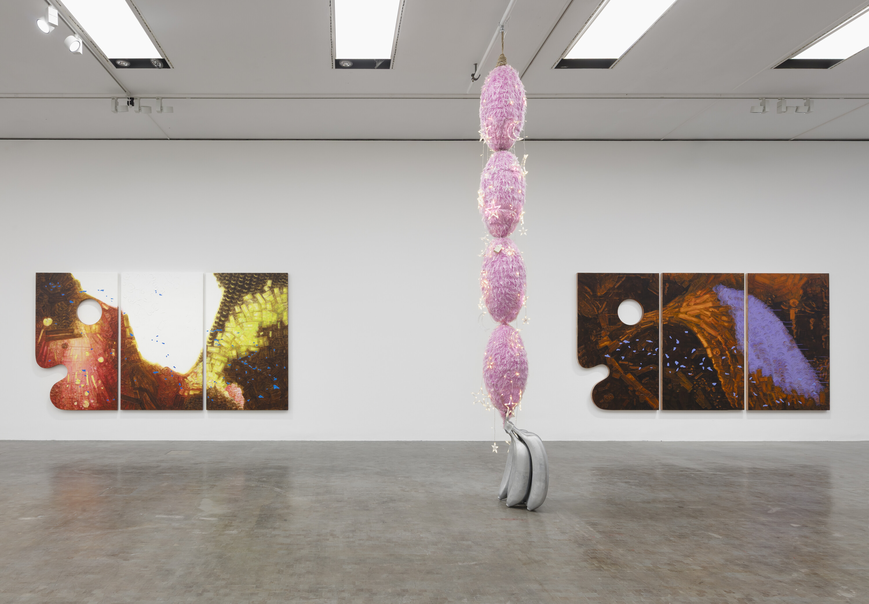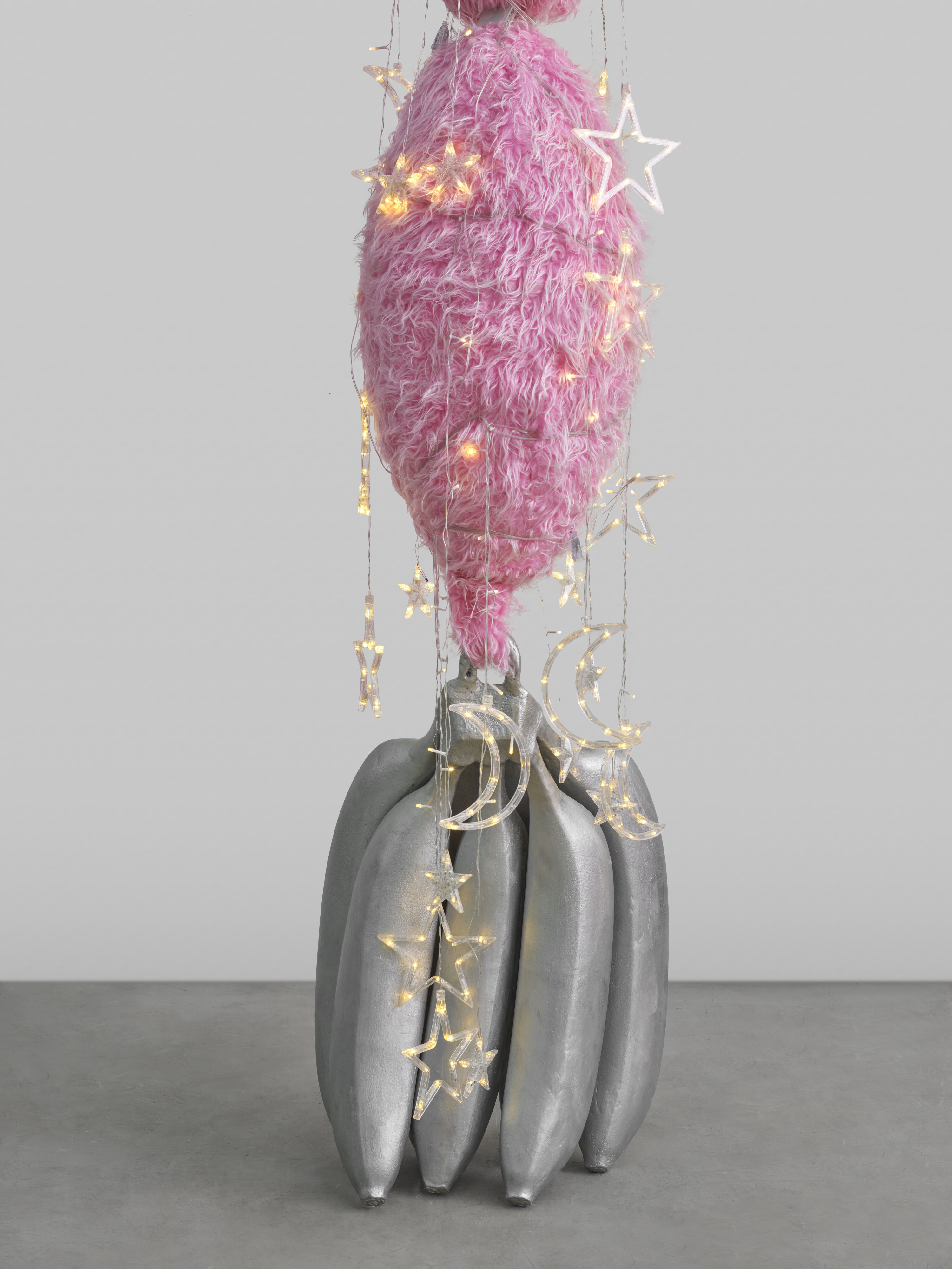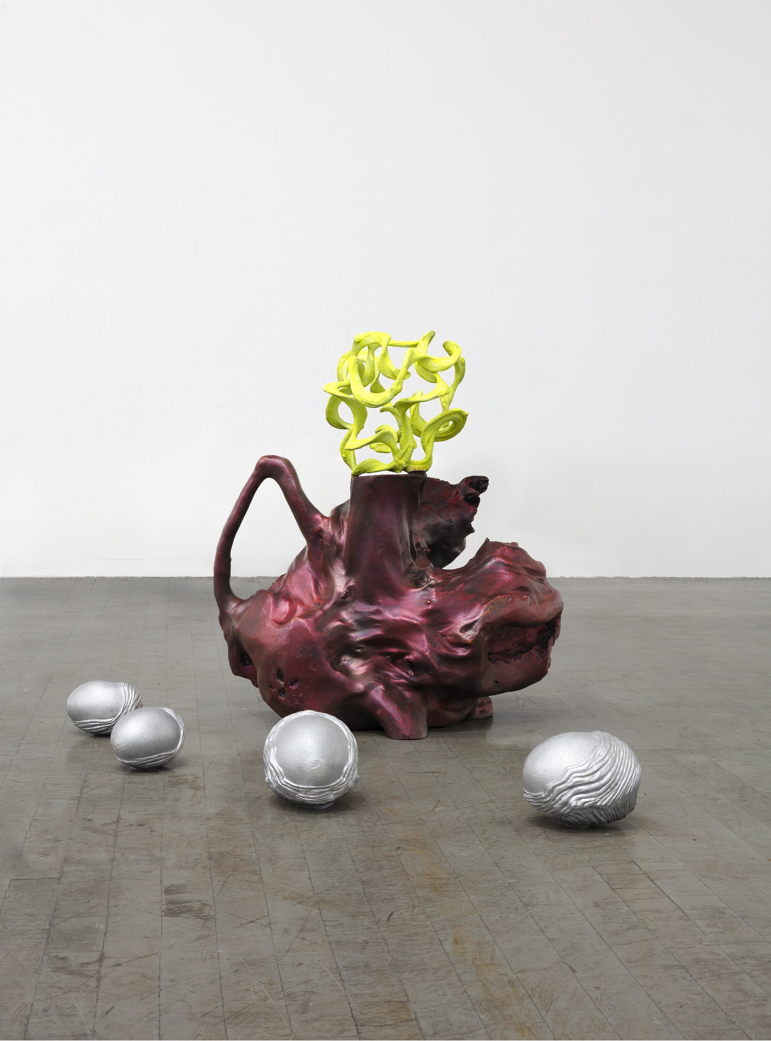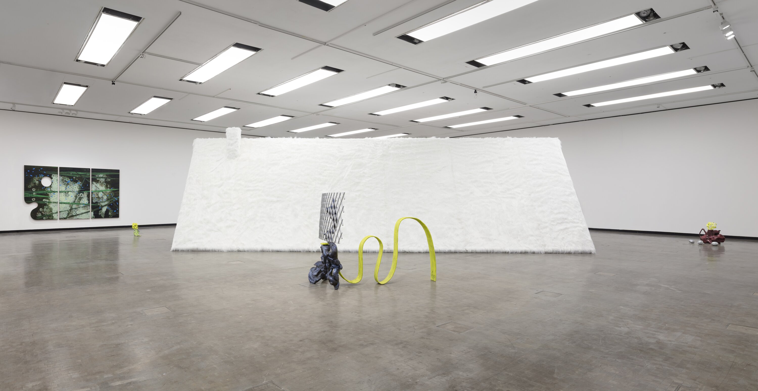 Eine große, pelzige Struktur teilt den Raum in zwei Hälften und bildet einen Tunnel in der Mitte der Ausstellung. Belebt durch Licht und Rauch beherbergt sie eine Sammlung von Objekten aus Aluminium, darunter überdimensionale Besteckteile, eine Mokkakanne und eine Reihe von vergrößerten Eiern. Außen befindet sich eine Reihe von knorrigen Baumwurzeln, die aus Messing gegossen, bemalt und mit Motorradteilen und zeichentrickhaften Wolken versehen sind. Diese anthropomorphen Skulpturen mit Gitterplatten oder antennenartigen Stäben bevölkern den Raum wie eine Gruppe von Figuren. Zwei modulare Säulen strecken jeweils rosa und blaue Arme aus Aluminium aus, deren klauenartige Sockel überdimensionalen Bananenstauden ähneln. An den Wänden simuliert ein Triptychon aus Tafeln große, palettenförmige Fenster, die mit einer dicken Farbschicht überzogen sind.