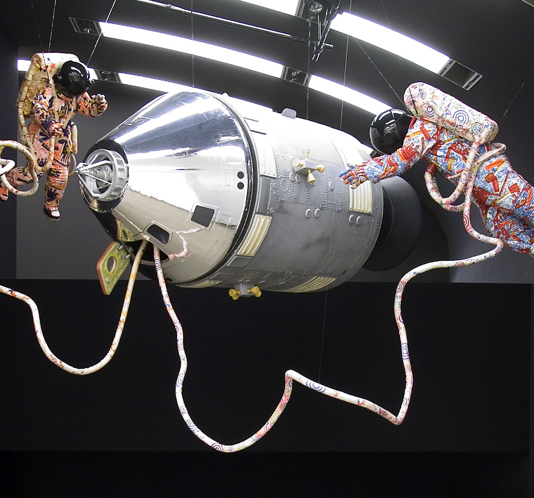 Eine englische Lady flaniert mit drei Ozeloten an der Leine durch den Raum, unter einer schwebenden Kutsche vergnügt sich eine Gruppe junger Adeliger beim Picknick, eine unter Bäumen schaukelnde Comptesse lässt uns lasziv ihren Schuh entgegengleiten. Exotisch farbenprächtig sind die Stoffe, aus denen die Gewänder dieser zwischen Ancien Régime und Victorianischer Epoche agierenden Figuren geschneidert sind. So wie manche Schaufensterpuppen auch tragen sie allesamt keine Köpfe.