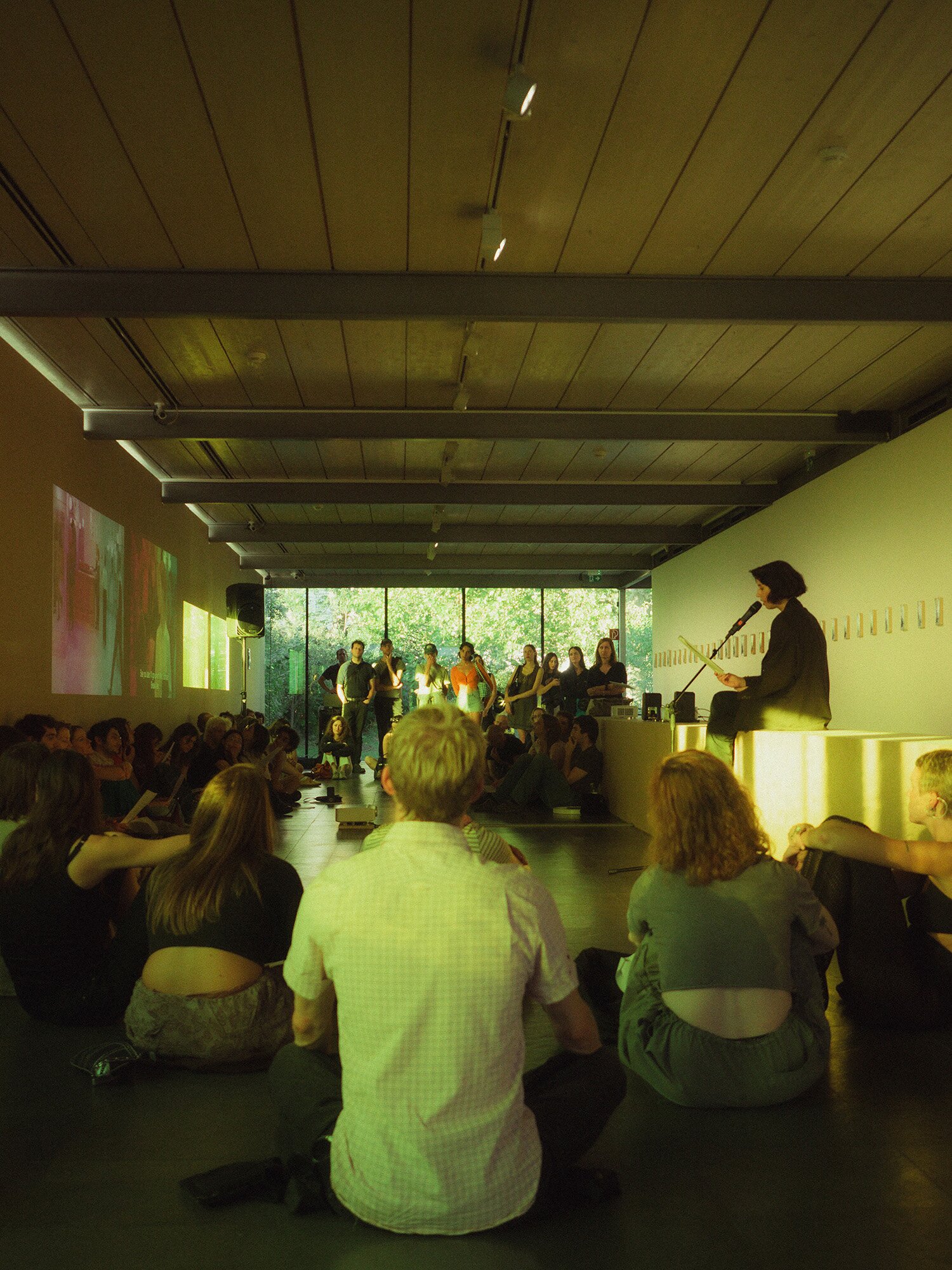 The performance unfolds across two acts, separated by a musical interlude, evoking the tonal dissonance between the literary source and its cinematic rendering. Berger takes on the role of narrator, director and performer, positioning herself in the interstitial space between text and image, original and adaptation. Through these gestures she addresses the dynamics of authorship and control: whose version is seen, whose voice is heard?