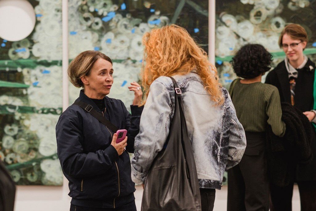 A large, furry structure bisects the space, creating a tunnel at the centre of the exhibition. Animated by light and smoke, it harbours a collection of cast aluminium objects including scaled-up items of cutlery, a moka pot and a series of enlarged eggs. Outside are a series of gnarled tree roots cast in brass, painted and appended with motorcycle parts and cartoon-like clouds of scribble. These anthropomorphic sculptures with mesh plates or antennae-like wands populate the space like a cast of characters. Two modular columns extend respectively pink and blue arms from aluminium, claw-like bases that resemble oversized bunches of bananas. On the walls, a triptych of panels simulates large, palette-shaped windows covered in a thick layer of paint.