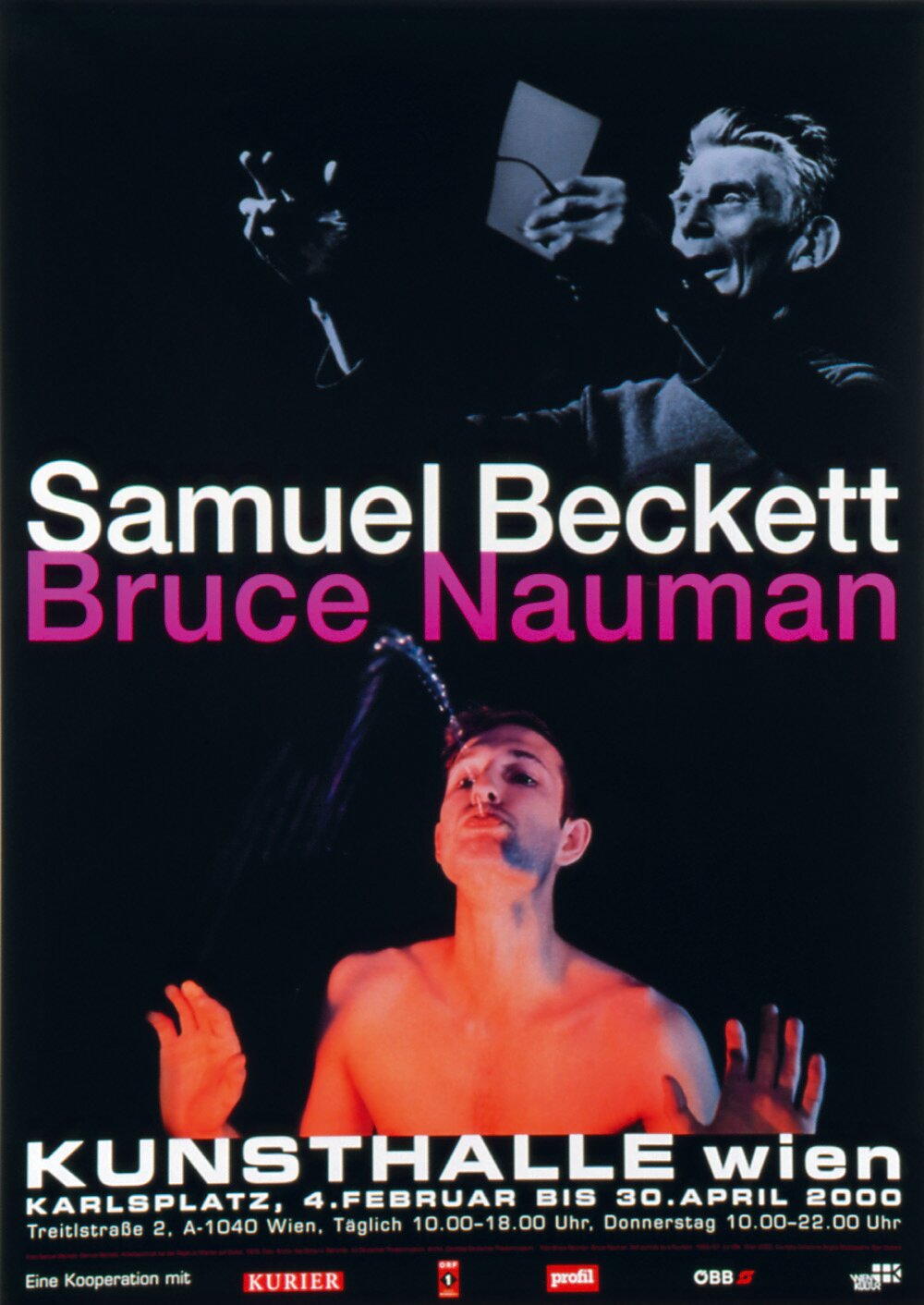 The work of the writer Samuel Beckett and the artist Bruce Nauman is among the most influential of our time. They both share an elemental preoccupation with the body and space. They pose fundamental questions facing humanity in the contemporary world, questions concerning the "condition humaine" and human identity in a manner which is both uncompromising and free from illusions. This exhibition represents a first attempt to bring together these two unique, intense and highly complex artists in one concept and space. More than any other artists, Beckett and Nauman offer an experience that stimulates the audience to detach itself from its familiar modes of perception and of thought, to open itself to other conceptions of space.