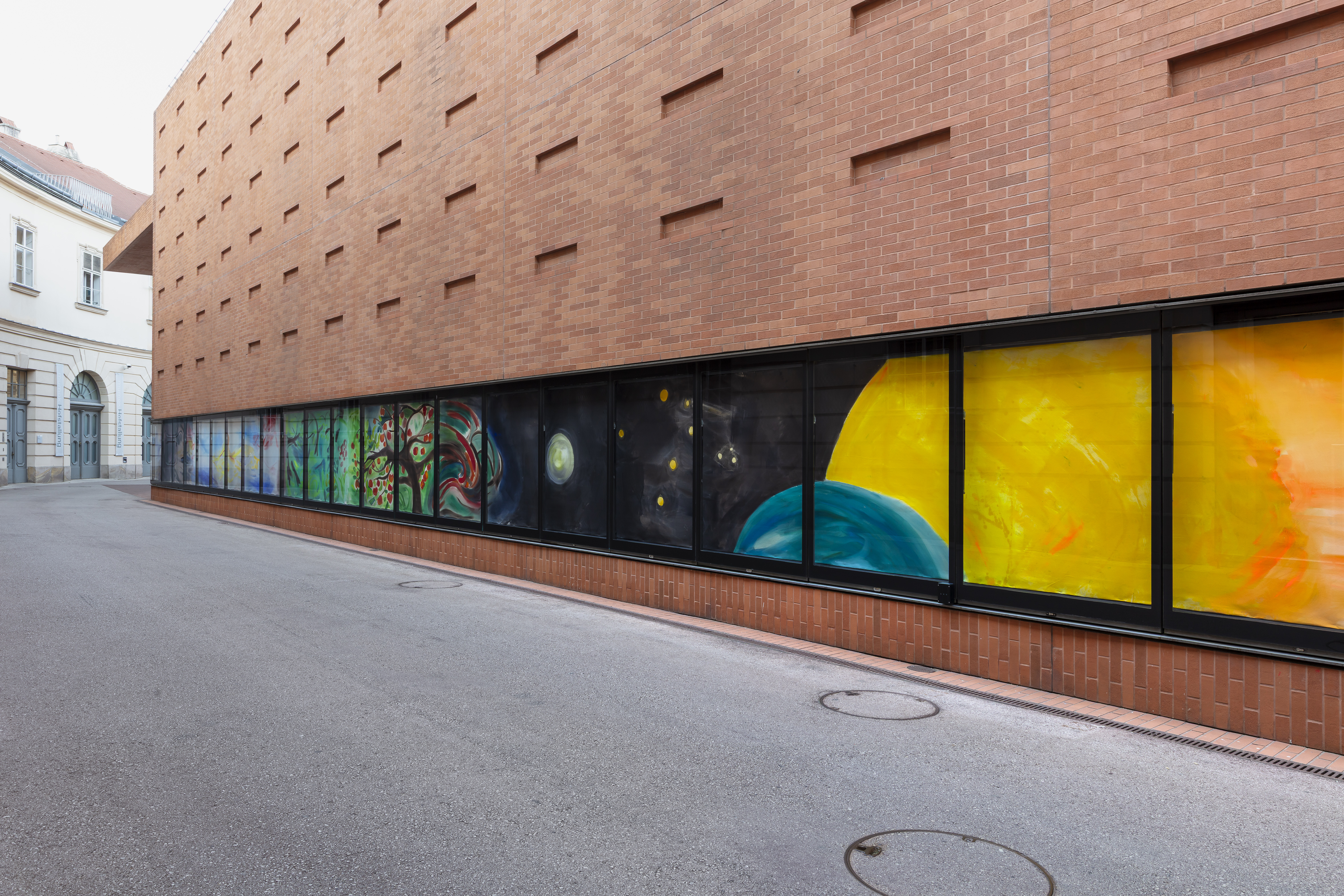 Von Hellermann’s commission combines subjects from natural sciences with references to the history of philosophy and culture informed in part by the work’s proximity to institutions such as Vienna’s Naturhistorisches Museum (Natural History Museum). Images of planets, the sun, moon and stars are accompanied by a proliferation of animals including deer, horses, birds and dolphins. A pair of black and white swans make a passing reference to the Viennese philosopher Karl Popper and his theory of Kritischer Rationalismus while other motifs include the Baum der Erkenntnis (Tree of Knowledge); the cave paintings at Lascaux and Plato’s speleological allegory.
