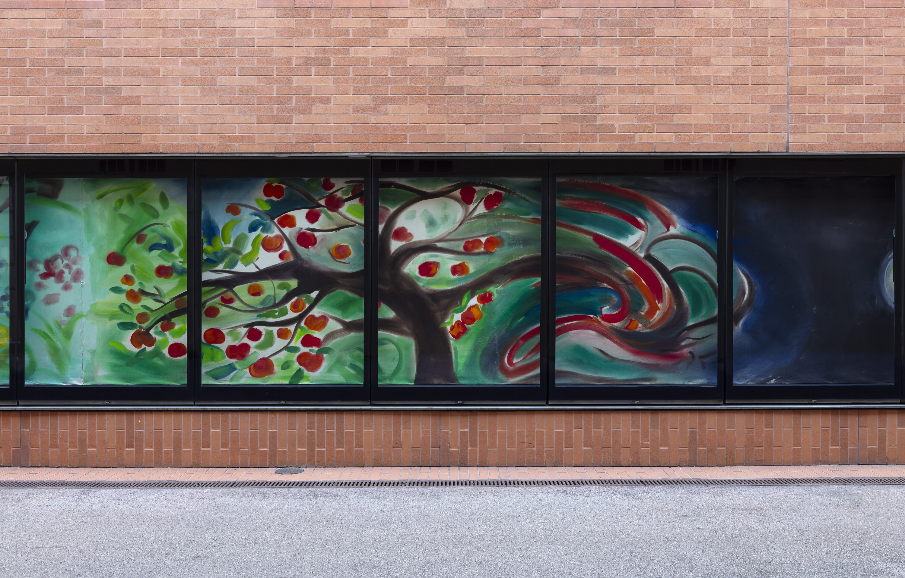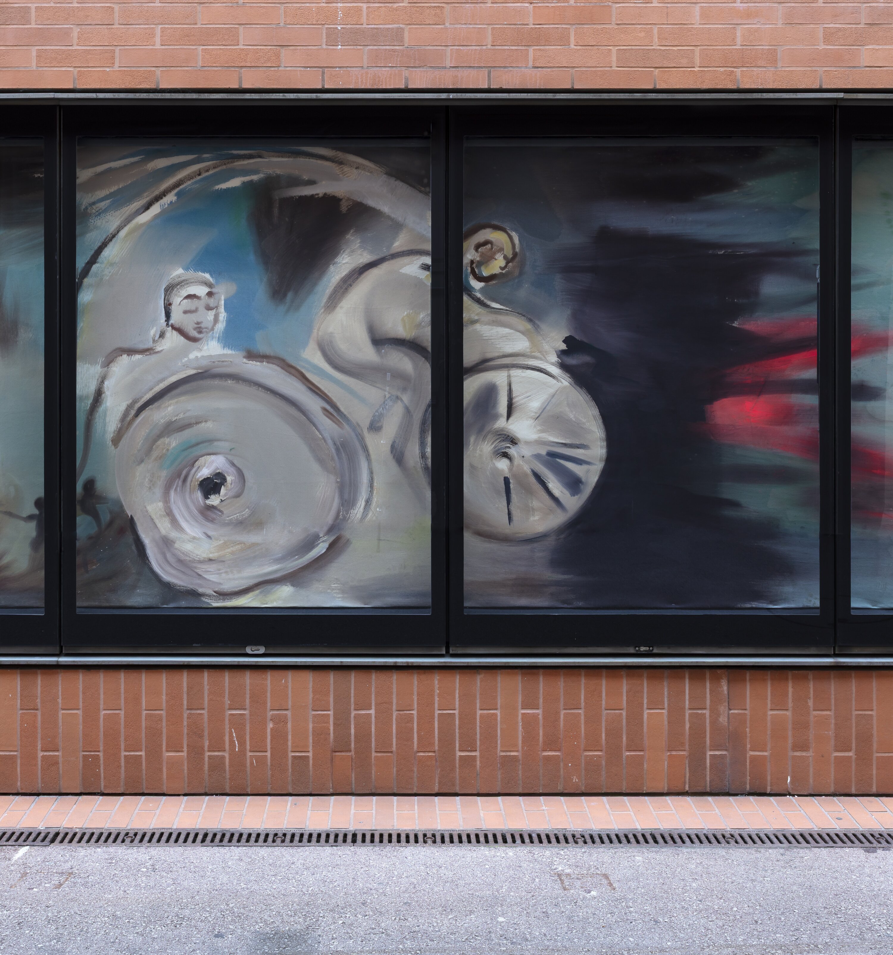 Sophie von Hellermann (b. 1975, Munich) has created an extensive new work on canvas for the 62-metre vitrine on the south-west wall of the Kunsthalle’s building. Von Hellermann’s paintings quote fact and fiction, drawing diversely from history and culture to develop expansive, narrative compositions. Using broad-brushes to apply acrylic and raw pigment on unprimed canvas, her images are imbued with a luminosity and a sense of movement and weightlessness that contributes to their fleeting, dream-like or cinematic quality.