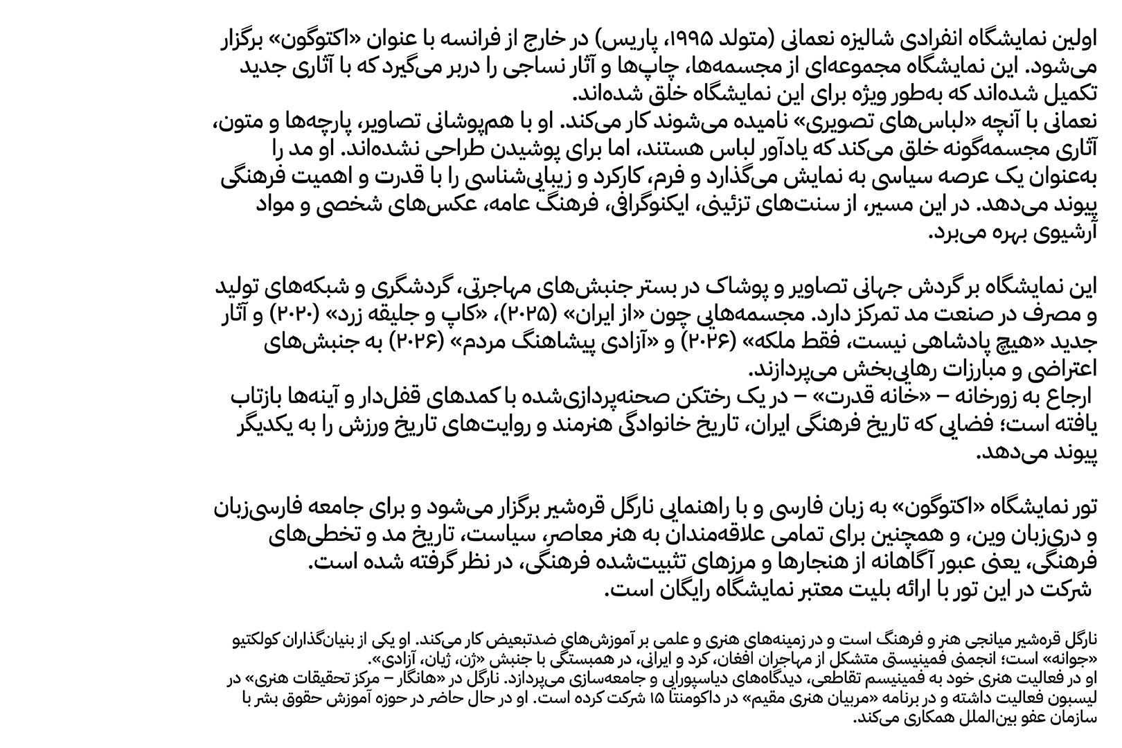 Nargol Gharahshir lädt die Farsi- und Dari-sprechende Community in Wien zu einer gemeinsamen Führung durch die Ausstellung ein. Die Veranstaltung wird auf Farsi durchgeführt und richtet sich an alle, die sich für zeitgenössische Kunst, Politik, Modegeschichte und kulturelle Überschreitungen interessieren.